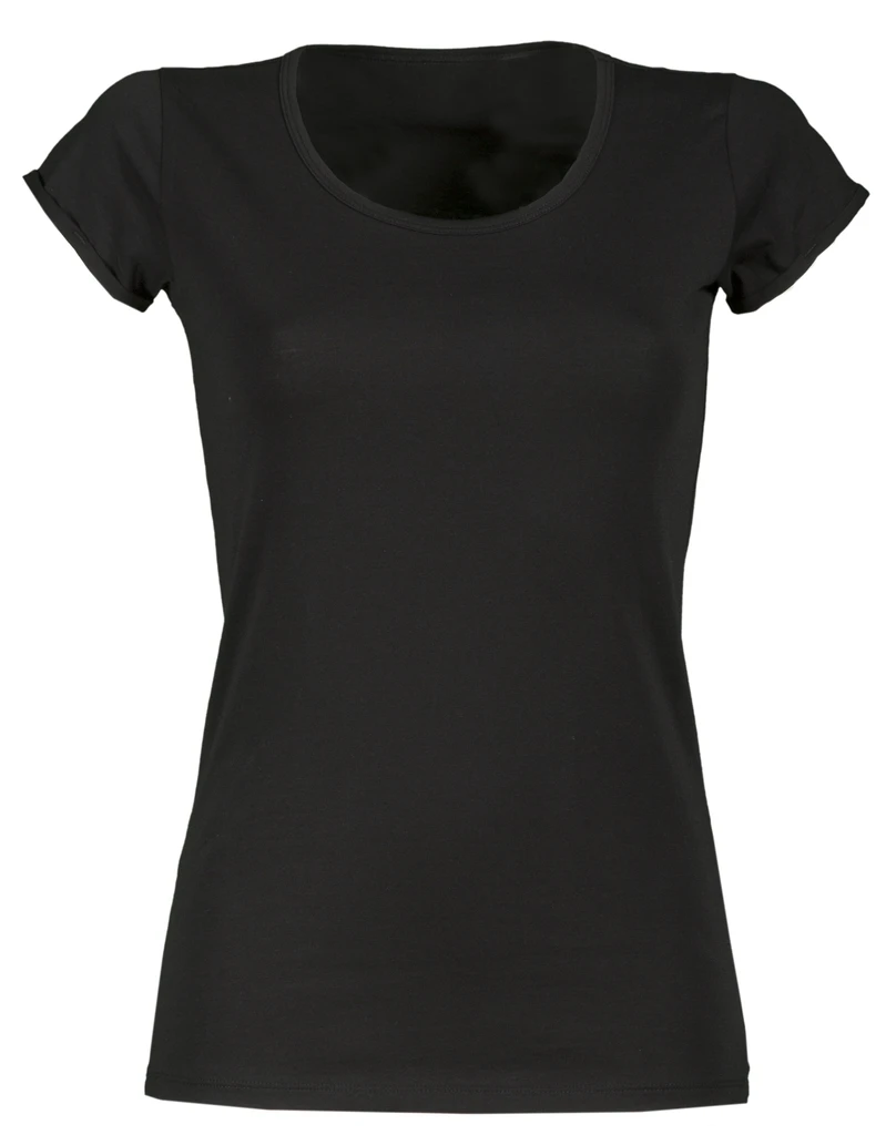 Tailliertes Damen-T-Shirt, kurzärmelig mit betontem Rundhalsausschnitt, schmalem Halsabschluss, Ärmeln mit schmalem, offenkantigem Aufschlag, Seitennaht, neutral ohne Etikett
