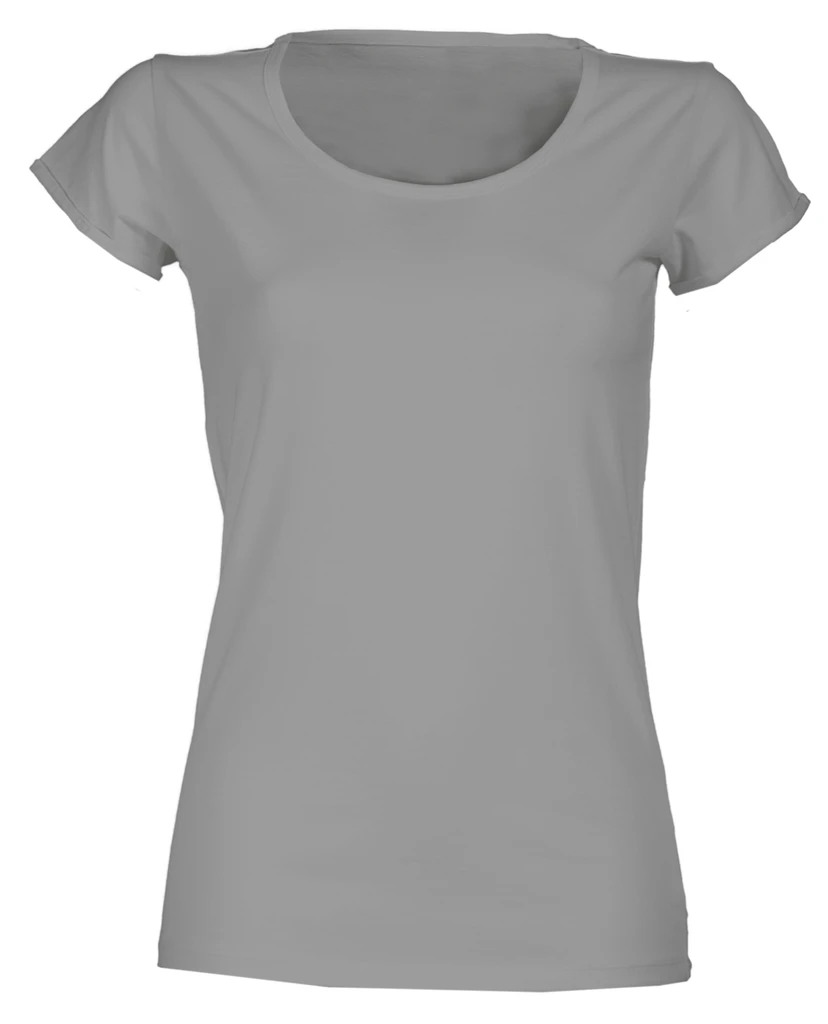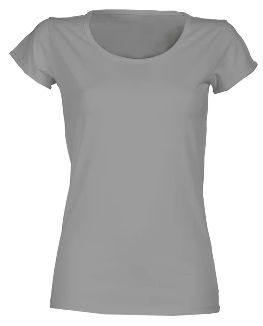 Tailliertes Damen-T-Shirt, kurzärmelig mit betontem Rundhalsausschnitt, schmalem Halsabschluss, Ärmeln mit schmalem, offenkantigem Aufschlag, Seitennaht, neutral ohne Etikett