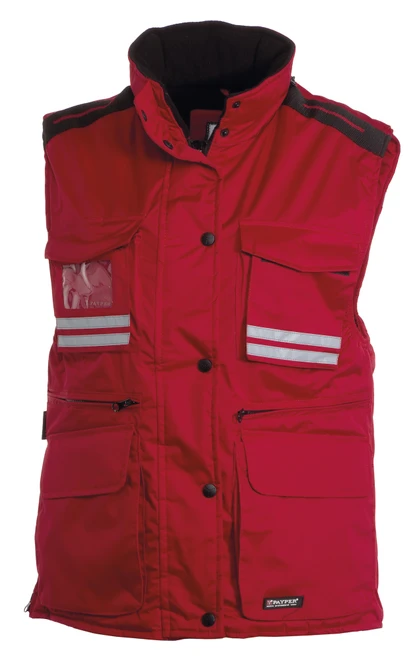 Taillierte Damen-Weste mit verdecktem 8 mm Reißverschluss aus Kunststoff mit Metallschieber und Kunststoffknöpfen, vorgeformter, abnehmbarer oder im Kragen einrollbarer Kapuze, grauen Reflexstreifen vorne und hinten, Seitenschlitz mit Ziehharmonikafalte und Reißverschluss, neun Außentaschen, davon zwei mit