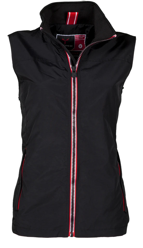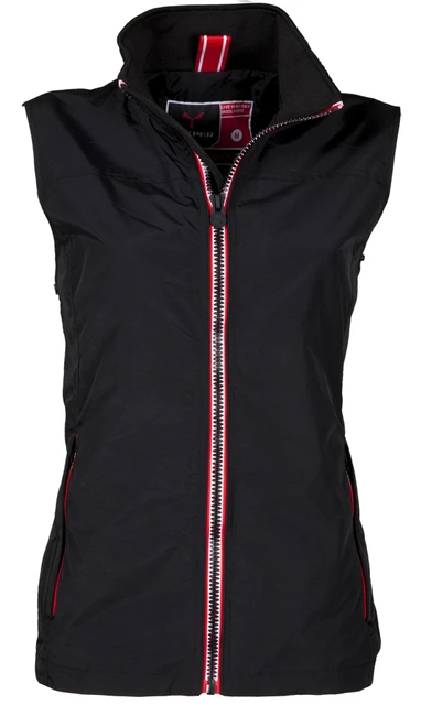 Damenweste mit elastischem Bund, Reißverschluss in Kontrastfarbe, 2 Außentaschen mit verdecktem Reißverschluss; Innenseite nicht wattiert, Netzfutter, 1 Innentasche mit Reißverschluss und Öffnung für Smartphone-Kopfhörer, Reißverschluss am Bund zum einfacheren Veredeln mit Druck und Stick