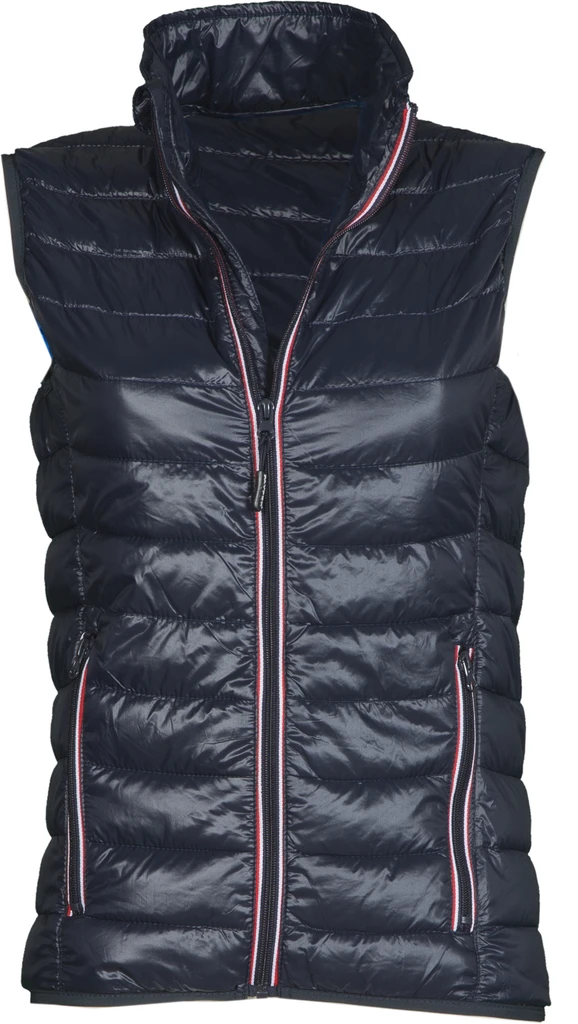 Taillierte Damen-Weste im Daunenlook mit Reißverschluss aus Nylon in Kontrastfarbe, feinem Saum an der Taille, zwei Außentaschen; Innenseite: Polyesterwattierung mit Dauneneffekt, drei Taschen