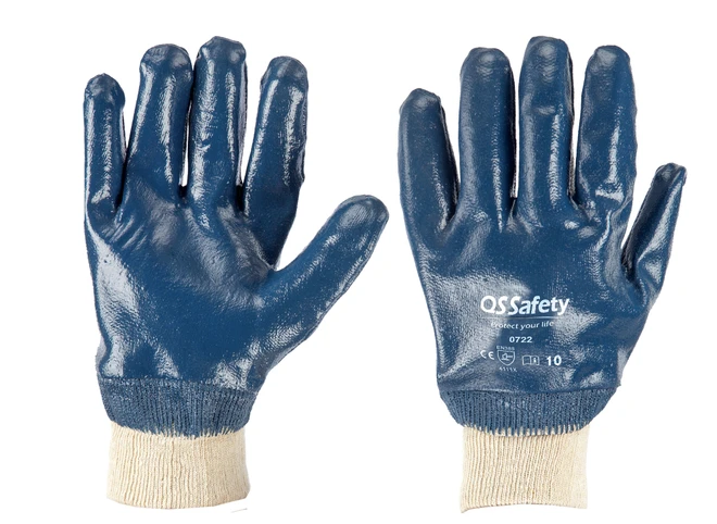 NBR-Handschuhe, komplett gefüttert, Strickbund, Baumwoll-Jersey-beschichtet; Eigenschaften: robust, sehr widerstandsfähig; Stärken: Passform, Griffigkeit, Schutz, beständig gegen Flüssigkeiten, praktisch; Einsatzbereiche: starke Beanspruchung, Metalle, scharfe und abrasive Materialien, Öl, Fett, Schmutz, Kohlenwasserstoffe, Schmiermittel
