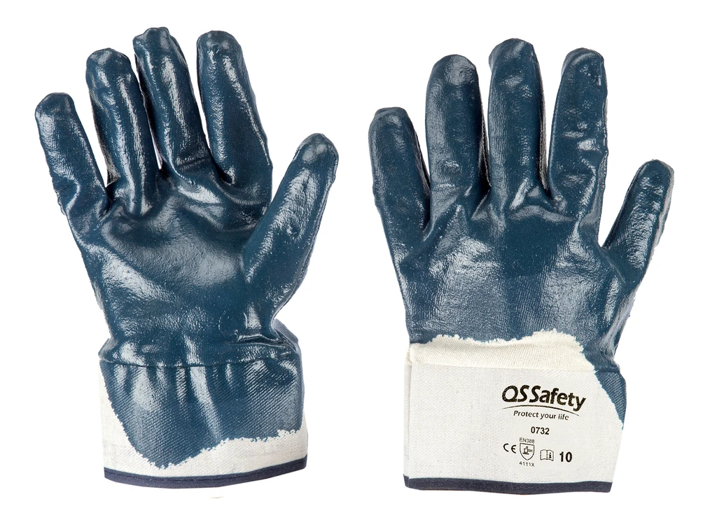 NBR-Handschuhe, belüfteter Rücken, lange Stulpe, Baumwoll-Jersey-beschichtet; Eigenschaften: robust, sehr widerstandsfähig; Stärken: Passform, Griffigkeit, Schutz, beständig gegen Flüssigkeiten, praktisch; Einsatzbereiche: starke Beanspruchung, Metalle, scharfe und abrasive Materialien, Öl, Fett, Schmutz, Kohlenwasserstoffe, Schmiermittel