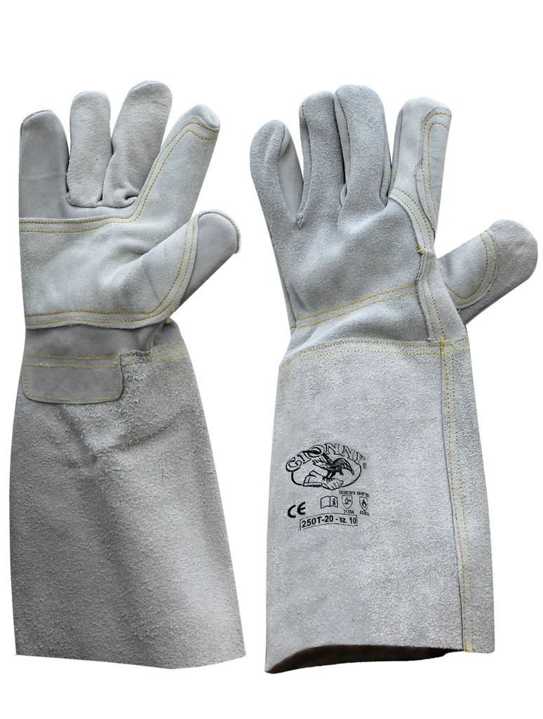 Rindspaltlederhandschuhe, verstärkte Spaltlederhandfläche, Daumen und Zeigefinger, Handgelenkschutz, 20 cm Spaltledermanschette; Eigenschaften: robust, sehr widerstandsfähig; Stärken: Griffigkeit, Schutz; Einsatzbereiche: schwere Handhabung, geeignet für den Kontakt mit heißem, entgratetem Material