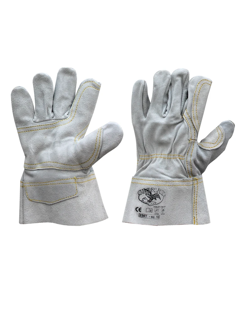 Rindspaltlederhandschuhe, verstärkte Spaltlederhandfläche, Daumen und Zeigefinger, Handgelenkschutz, 7 cm Spaltledermanschette; Eigenschaften: robust, sehr widerstandsfähig; Stärken: Griffigkeit, Schutz; Anwendungsbereiche: schwere Handhabung, geeignet für den Kontakt mit heißem, entgratetem Material