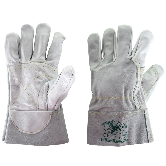 Rindslederhandschuhe mit geteilter Lederrücken- und Vollnarbenverstärkung, Handfläche und Daumen, Daumenschutz - Ledermanschette - Kevlar-Steppnaht; Eigenschaften: weich, stark, widerstandsfähig; Stärken: Komfort, einfache Handhabung - Anwendungsbereiche: allgemeine Handhabung in trockener Umgebung Bedingungen