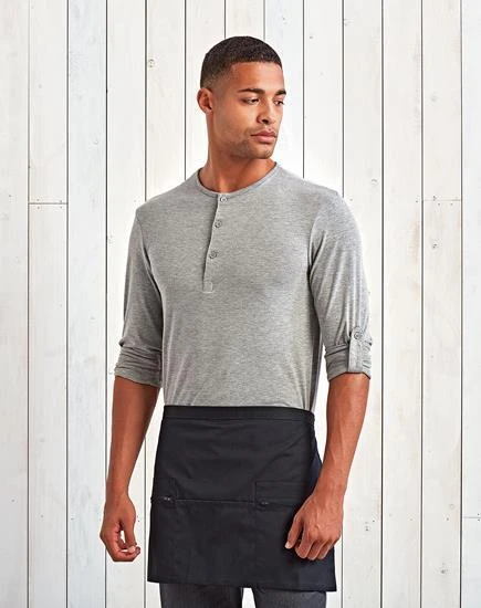 Eine kurze Taillenschürze mit zwei seitlichen Reißverschlusstaschen und einer offenen Mitteltasche, die sich ideal zum Tragen von Tablet-Geräten eignet. Eine beliebte Schürze für das Bedienungspersonal, die aus einem strapazierfähigen Polycotton-Gewebe besteht, das wiederholtem Waschen standhält.