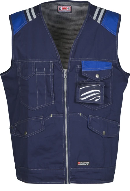 Zweifarbige Herren-Weste mit Reißverschluss aus Kunststoff, Weitenregulierung der Taille mit Knopf, drei Vordertaschen mit LOCK SYSTEM, davon zwei im Känguruschnitt mit Patte und Metallknopf, abtrennbarem